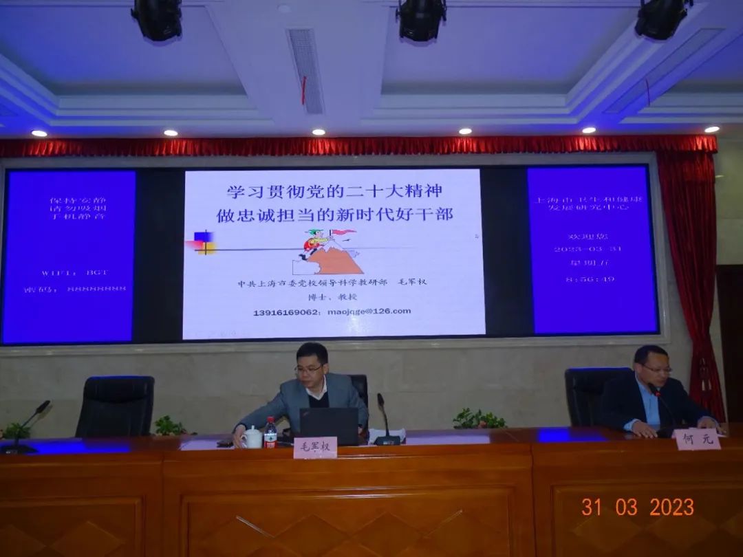 中共上海市委党校领导科学教研部主任、教授毛军权作《学习贯彻党的二十大精神,做忠诚担当的新时代好干部》的专题讲座。毛教授从必须把提高政治能力放在第一位、准确把握本职岗位的使命担当和正确处理三种关系三个方面阐释了在新时代背景下领导干部的新使命。他指出,在开启全面建设社会主义现代化国家新征程的路上,每一位领导干部都要自觉锤炼忠诚干净担当的政治品格,经受住风浪考验,真正成长为事业高质量发展中政治上可靠,作风上过硬的好干部。