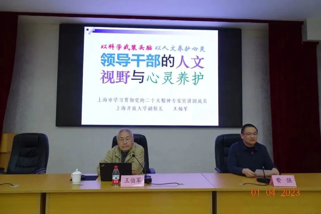上海开放大学校长、教授王伯军作《领导干部的人文视野与心灵养护》的专题讲座。王教授从感恩与忠诚、敬畏与干净、责任与担当、放下与淡泊等几个方面,结合历史人物、诗歌经书、事实案例,讲述了“以科学武装头脑,以人文养护心灵”的重要性。